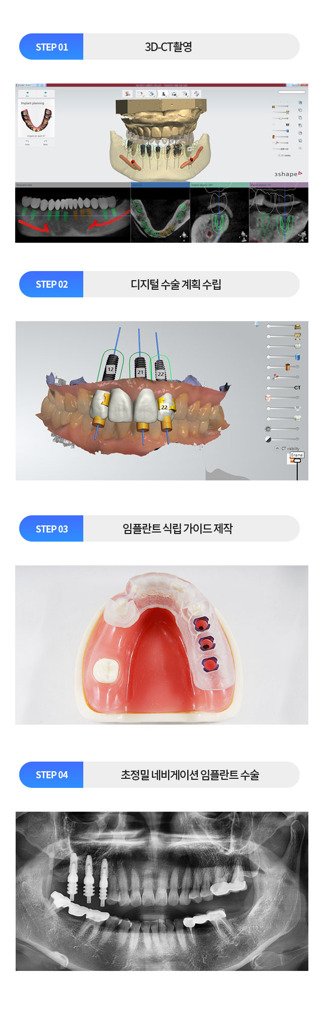 치료의 정확성과 신속성을 위해 디지털 장비로 치조골의 구조와 신경 위치를 확인하여 치료 계획을 수립하고, 모의 수술 및 수술용 가이드 제작을 통해 보다 빠르고 정확한 임플란트 식립이 진행됩니다.