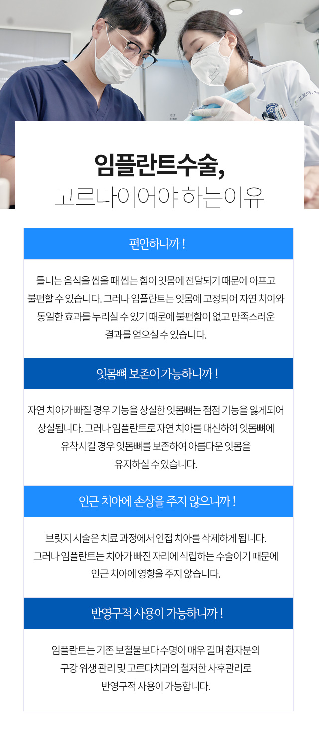 치료 방법으로 간단한 수술이 아니기 때문에 임플란트 임상경험이 풍부하며