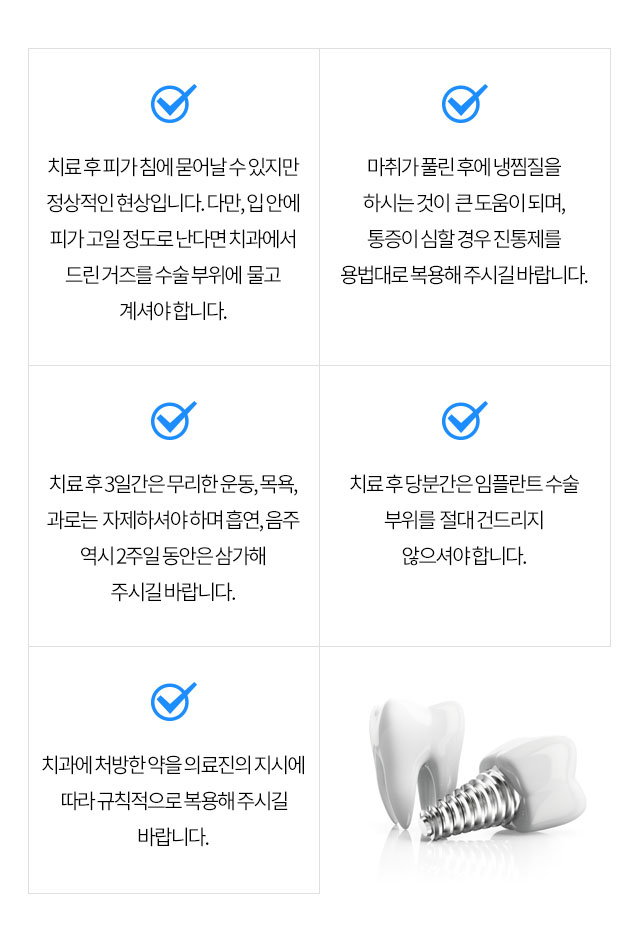 임플란트 수술 후 출혈, 통증, 붓기, 임플란트 주위염 등의 부작용이 있을 수 있습니다.
