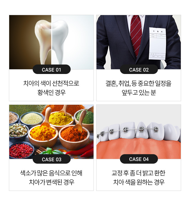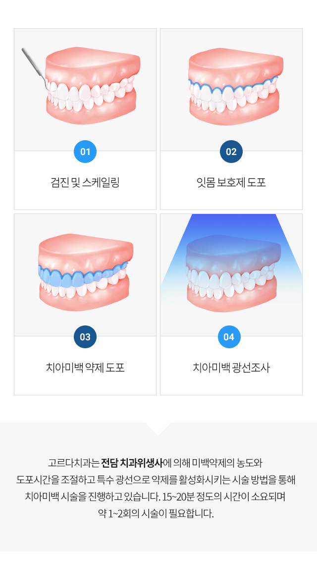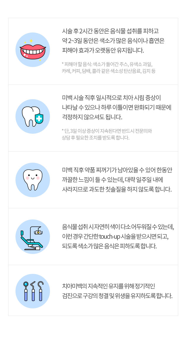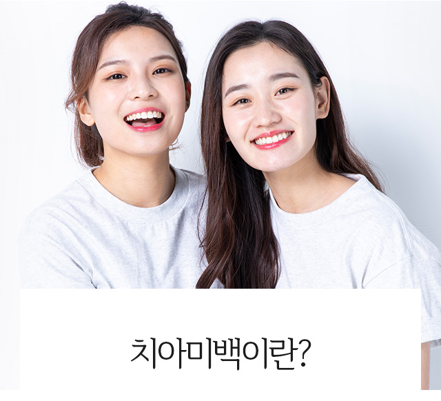치아미백이란 여러 가지 원인에 의해 변색된 치아를 하얗게 만들어주는 시술입니다. 화학적인 작용으로 치아 손상 없이 밝고 하얗게 회복시킵니다. 칫솔질이나 스케일링으로 개선되지 않는 치아의 색을 기존 색조로 회복시키거나 더 밝게 만들 수 있습니다.