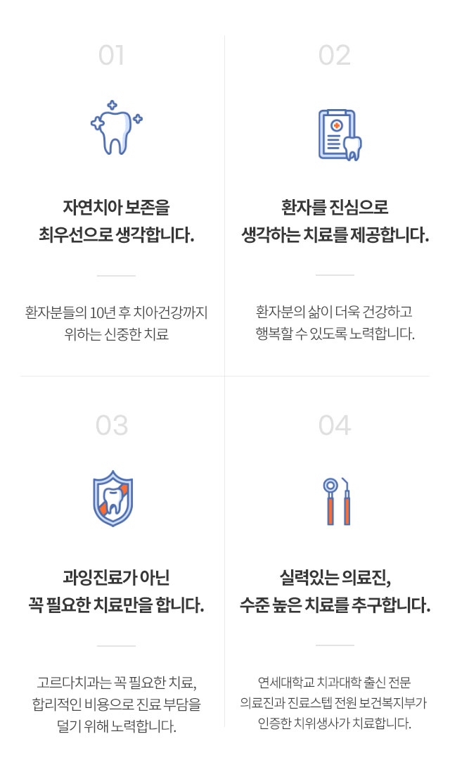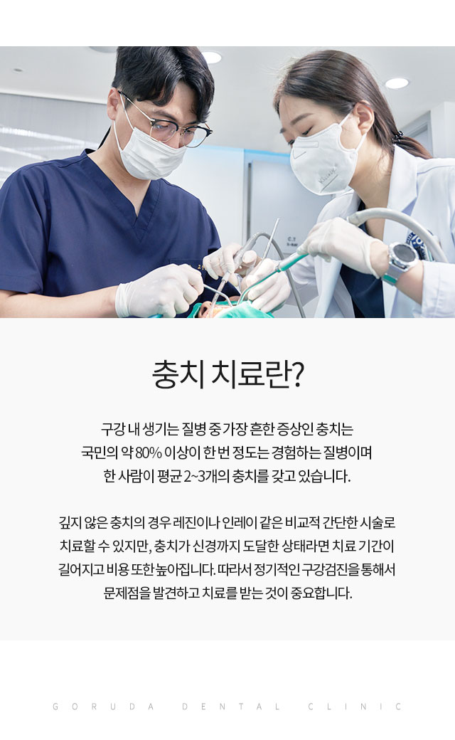 한 번 손상된 치아는 자연적으로 회복되지 않기때문에 초기에 치료를 받는 것이 중요합니다. 충치를 방치하여 적절한 치료 시기를 놓칠 경우 자연치아를 상실하는 상황까지 발생할 수 있으니 정기적인 검진을 통해 빠른 치료를 받는 것이 좋습니다.