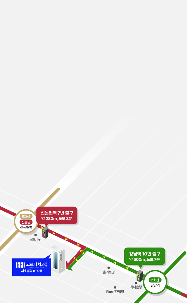 서울특별시 서초구 서초동 1309-6 서호빌딩 8, 9층 고르다치과 강남역 10번 출구에서 500m 도보 7분 신논현역 7번 출구에서 495m 도보 3분