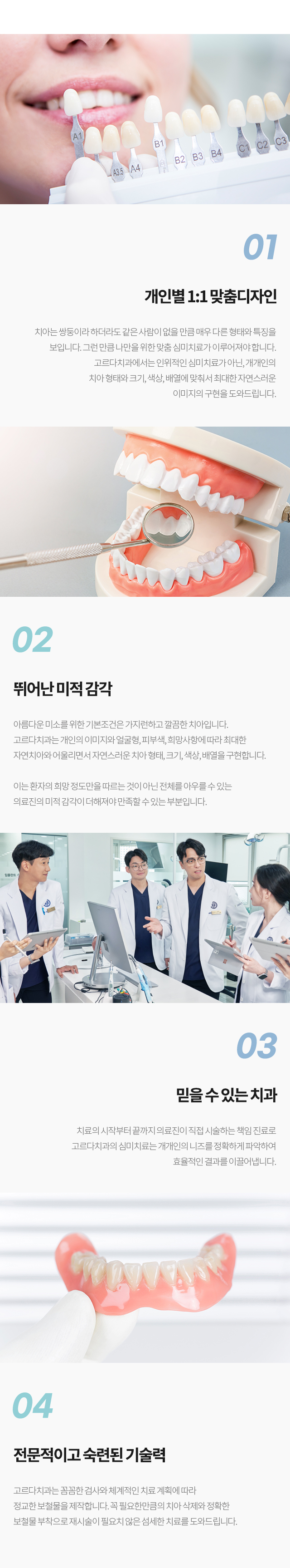 심미치료 시 이루어지는 치아삭제는 재생이 이루어지지 않는 과정입니다. 따라서 고르다치과에서는 환자의 본래 치아를 최대한 살릴 수 있는 치료를 먼저 생각한 후 이를 토대로 심미치료 과정을 결정합니다.