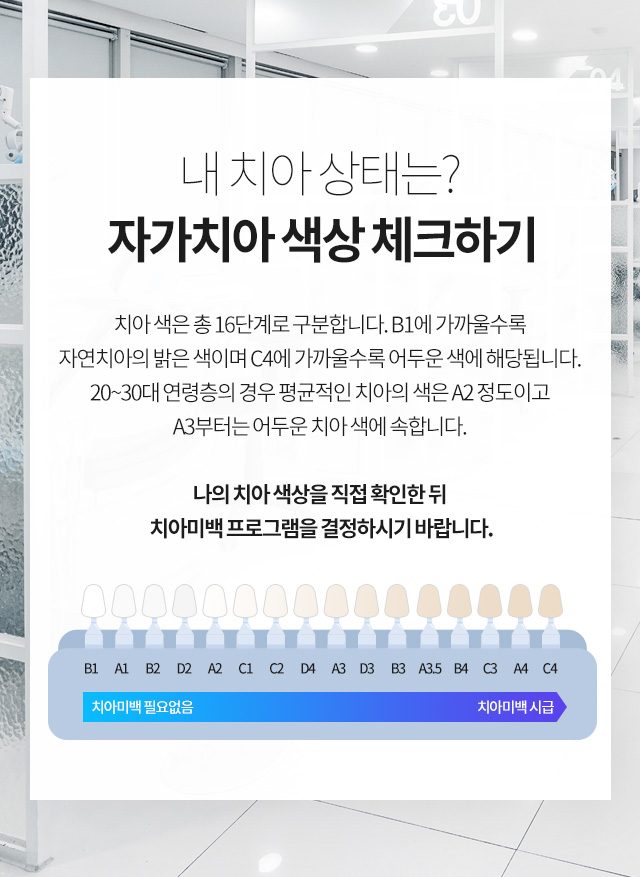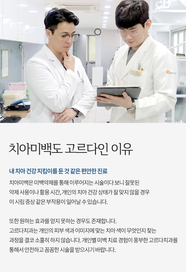 치아미백이란 여러 가지 원인에 의해 변색된 치아를 하얗게 만들어주는 시술입니다. 화학적인 작용으로 치아 손상 없이 밝고 하얗게 회복시킵니다. 칫솔질이나 스케일링으로 개선되지 않는 치아의 색을 기존 색조로 회복시키거나 더 밝게 만들 수 있습니다.