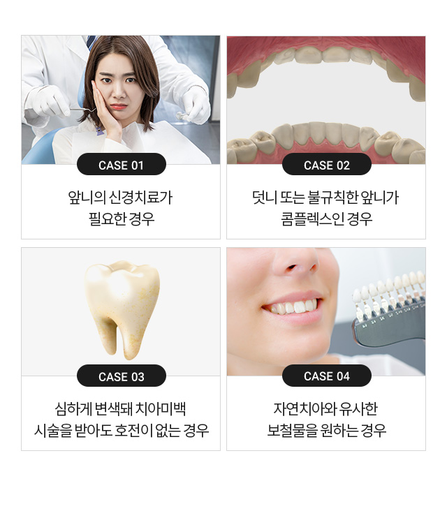 고민이 있는 경우단기간에 치아 색, 모양, 크기, 배열을 바꿀 수 있는