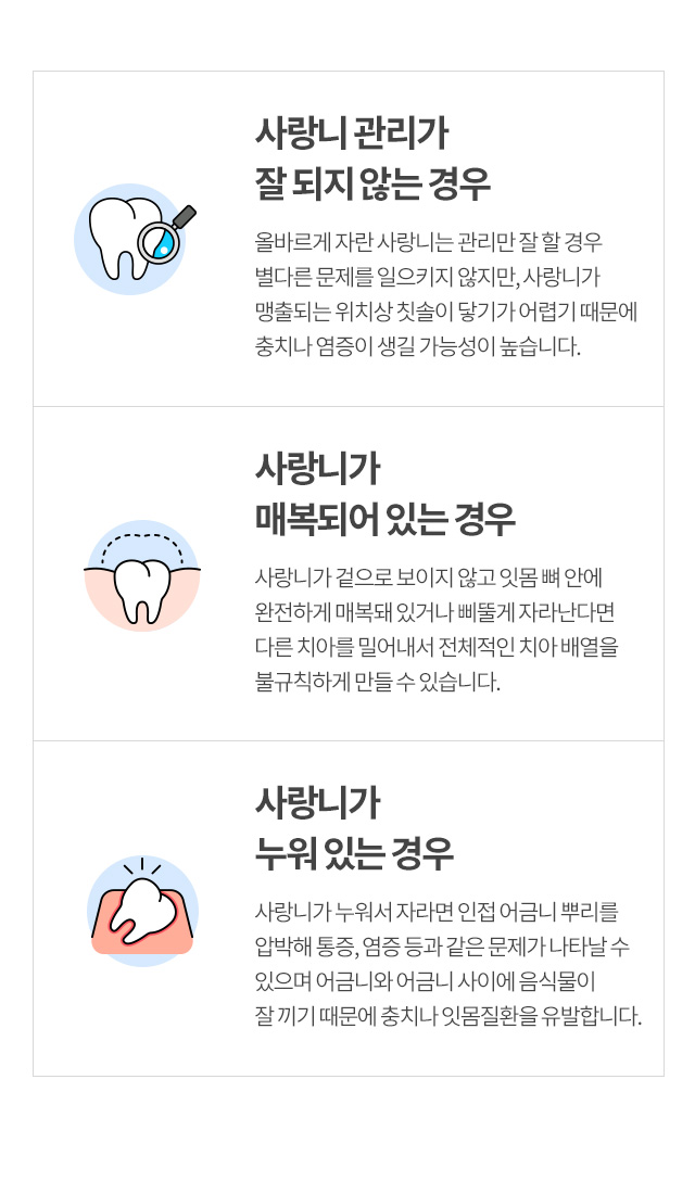 청소가 잘 되지 않아 염증이 쉽게 생깁니다. 따라서 사랑니와 인접한 치아를